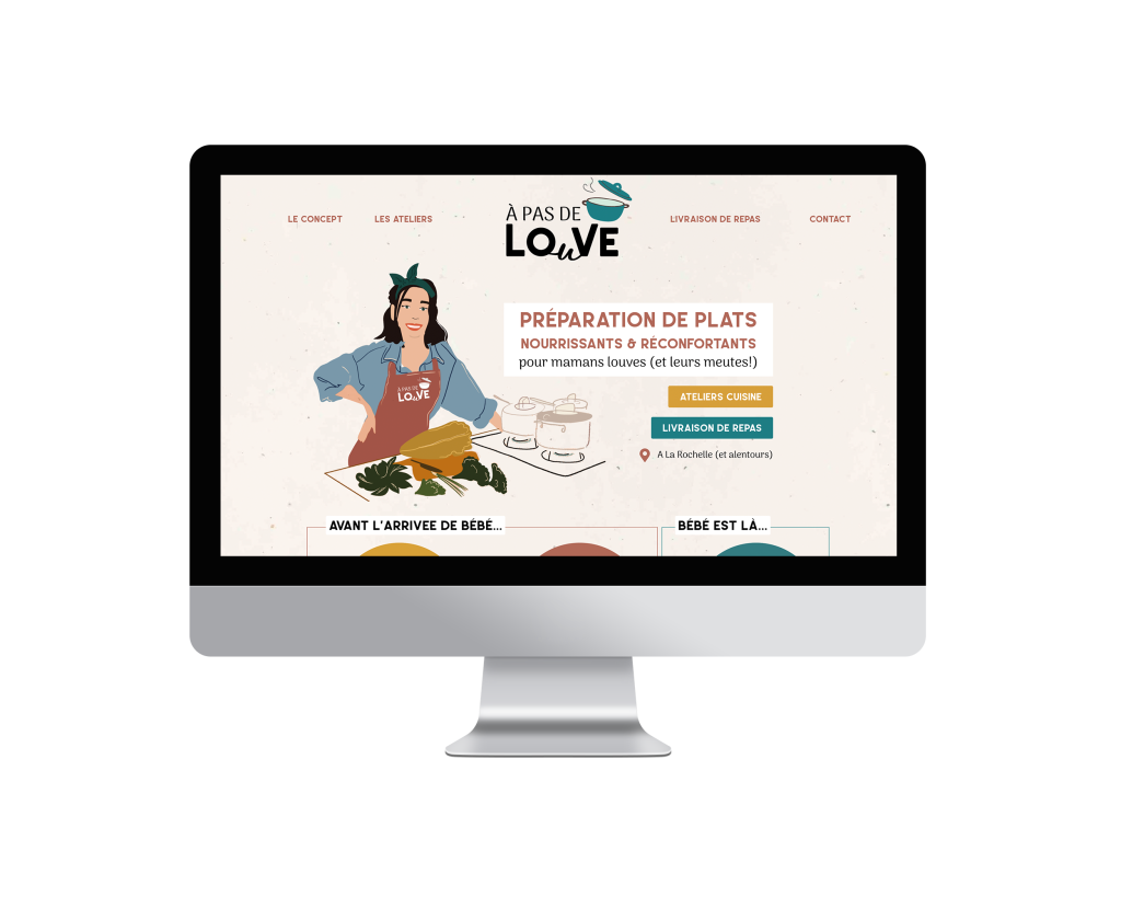 Pour le projet « À pas de Louve », traiteur post-partum basé à La Rochelle, nous avons conçu une identité visuelle complète et cohérente, reflétant les valeurs de bienveillance, de naturalité et de réconfort portées par la fondatrice.Notre intervention a couvert la création du logo, du site web, des cartes de visite, des flyers, fiches recette, etc., assurant une harmonie graphique sur l’ensemble des supports.