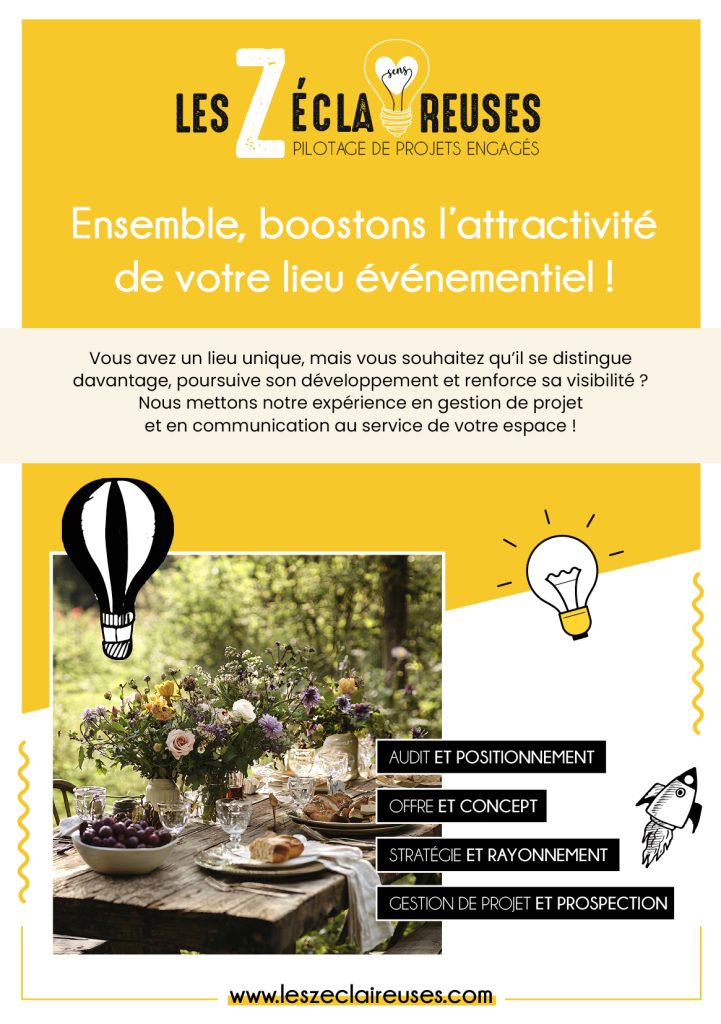 Les Z’éclaireuses accompagnent les lieux événementiels pour concevoir des expériences innovantes, créer de nouvelles offres et dynamiser leur attractivité. Nous structurons vos projets, imaginons des formats originaux et coordonnons chaque étape pour faire de votre lieu un véritable acteur d’expériences mémorables.